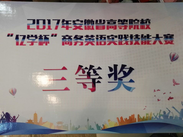 2017年5月26—27日,首届安徽省高等院校“亿学杯”商务英语实践大赛在安徽财经大学举办。永利官网外国学院代表队由英语专业商务英语方向的王芳、刘苏苏和魏云三位同学组成。经过26日的精心准备和27日的顽强努力,永利官网代表队荣获三等奖。