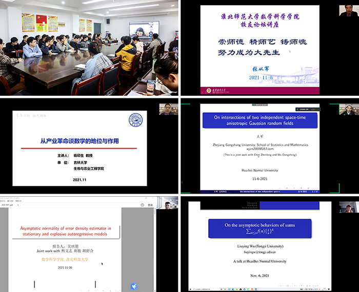 学术报告会上,应邀出席论坛的两位优秀校友分别是来自南京财经大学的张从军教授、吉林大学的杨印生教授。张从军教授做了题为“崇师德、精师艺、铸师魂”的学术报告;杨印生教授做了题为“从产业革命谈数学的地位和作用”的学术报告。另外来自浙江工商大学、安徽大学和同济大学的三位在读博士依次作了相关方向的学术报告,报告内容紧扣学科发展前沿,主题鲜明。此次报告会线上、线下气氛热烈,参会师生均受益匪浅。论坛结束后,学院以在线方式召开了博士、校友座谈会。与会的校友和博士畅所欲言,对学院的学科建设、人才引进和学生培养建言献策。